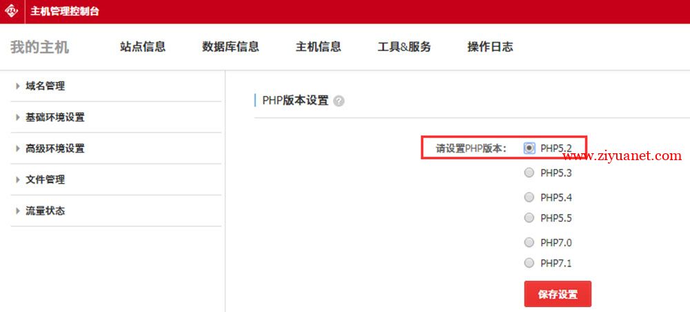 我的主机 - 高级环境设置 - PHP版本设置 - 修改为PHP5.3 - 保存设置